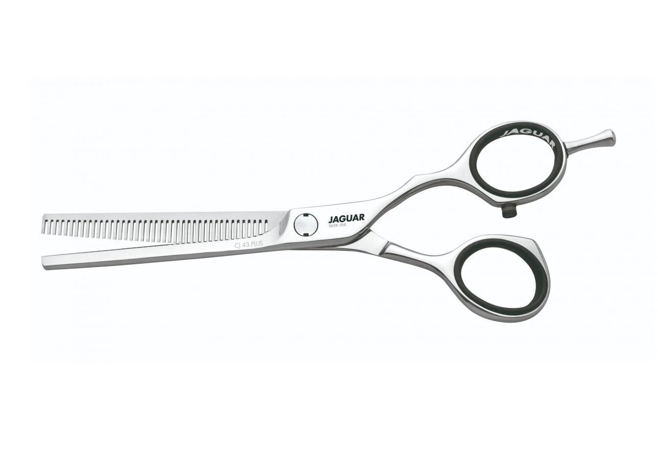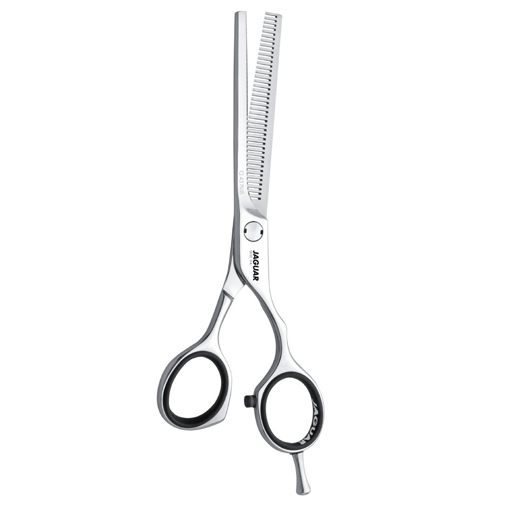 43 V-shaped thinning teeth lend a smooth, easy feeling when closing. Squeezing and pushing of the hair is avoided. The hair is cut easily and precisely.