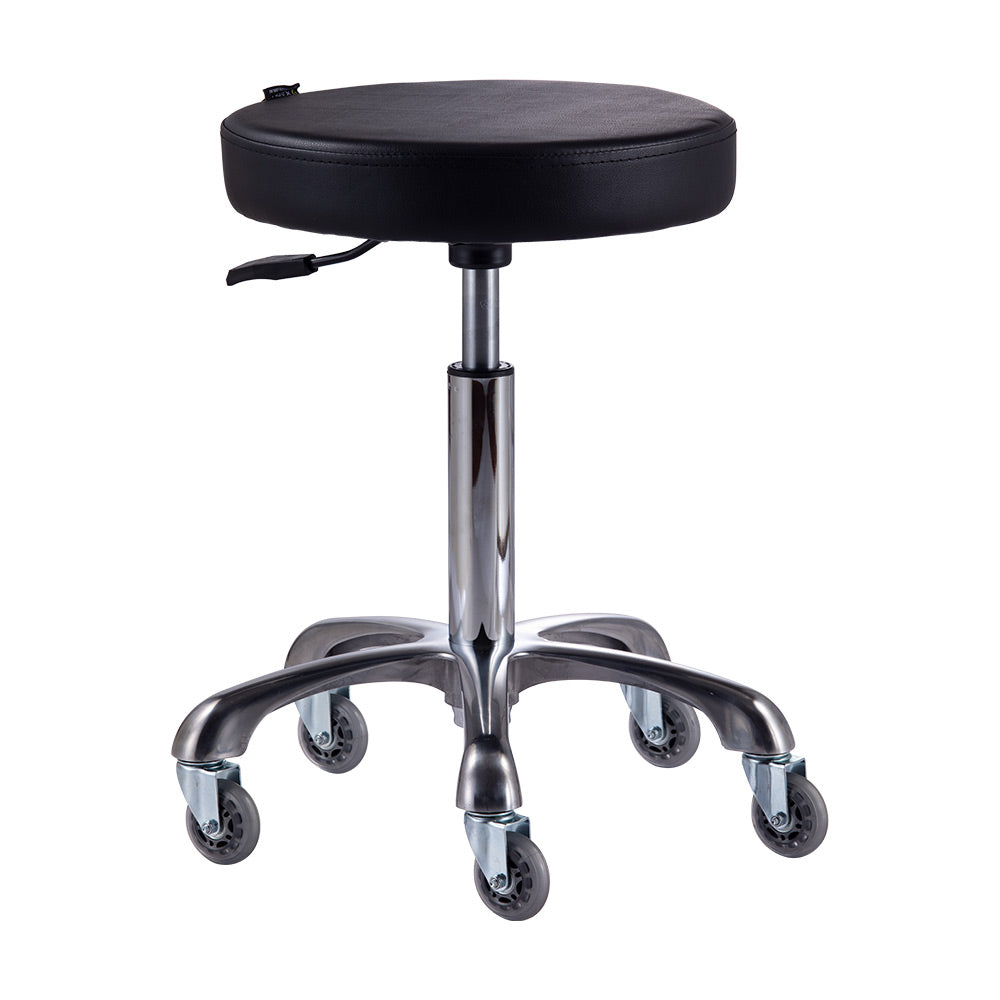 Round cutting stool with sturdy aluminium base and high quality hair free wheels with bearings and rubber castors that will not mark your floors.