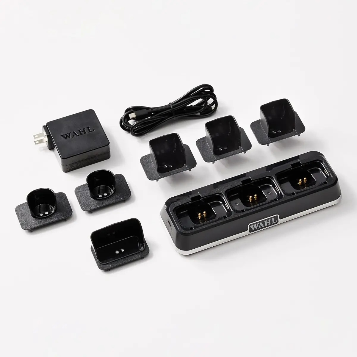 Effortlessly charge up to three Wahl Professional cordless clippers, trimmers, and shavers at once with the Wahl Professional Power Station – 3 Ports. The interchangeable inserts in the Power Station cater to each specific tool, and you can even charge a phone or tablet through the USB-C port. Streamline your barber station with a single cord and v-cord channel, while following the included operating instructions for optimal use.